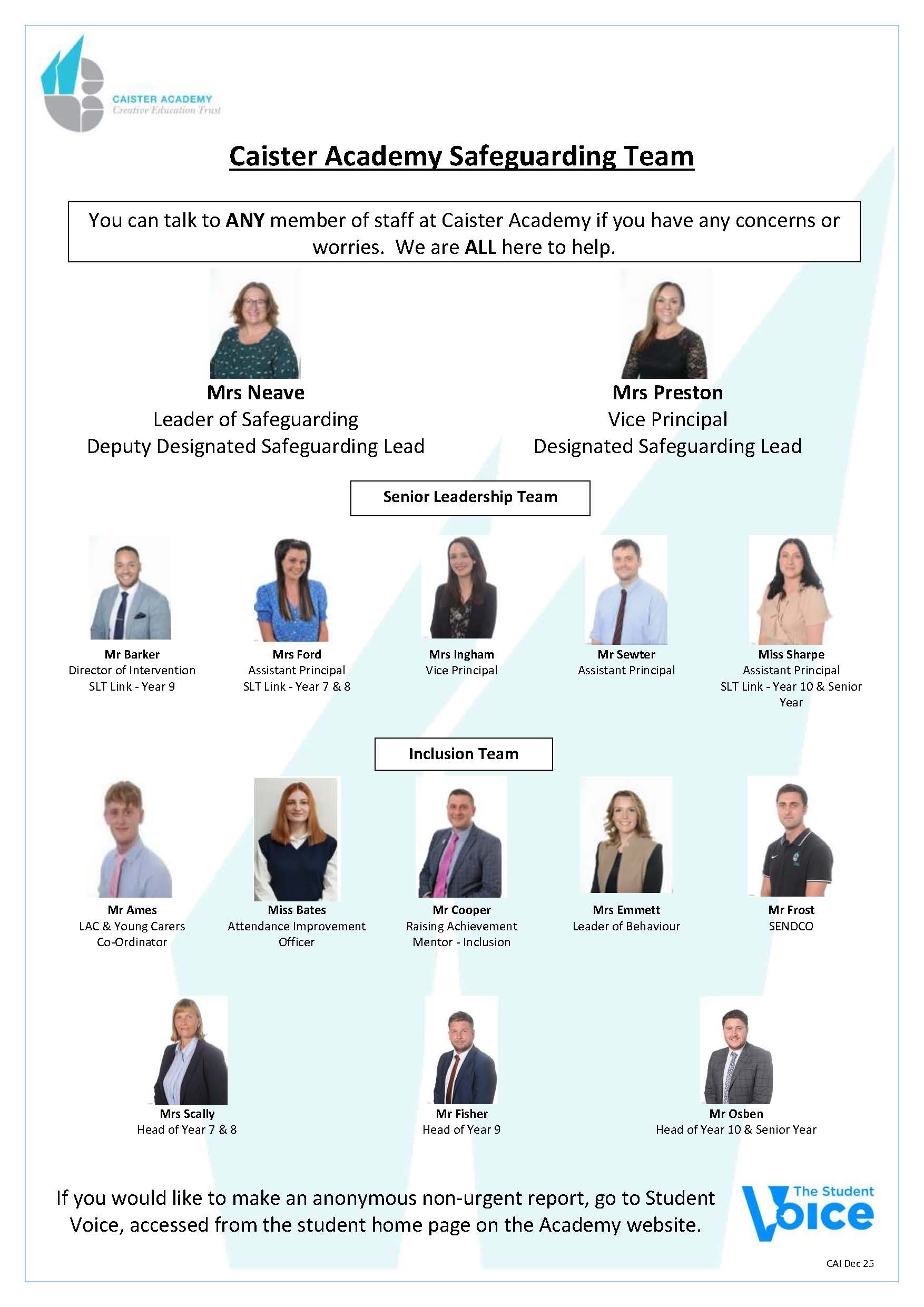 At Caister Academy we place the highest priority on safeguarding children. To ensure all students are safe, we need the support of all staff, parents, visitors, governors and our community. If you have any concerns or worries about the safety and welfare of our students, please inform the Safeguarding Team immediately.